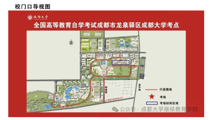 路线1:地铁四号线成都大学站C 口出从成都大学南门进校需步行1.7公里20分钟左右到达考场: