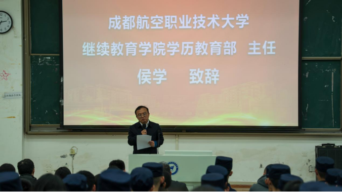 2025年11月11日,成都信息工程大学与成都航空职业技术大学在成都航空职业技术大学龙泉校区联合举行2025年秋季自考本科新生开班仪式,共同迎接365名新生正式开启本科学习新征程。成都信息工程大学继续教育学院党委书记易平、自考科科长梁波,成都航空职业技术大学继续教育学院副院长刘宇、学历教育部主任侯学等领导及教师代表出席仪式。仪式由学生李依露主持。