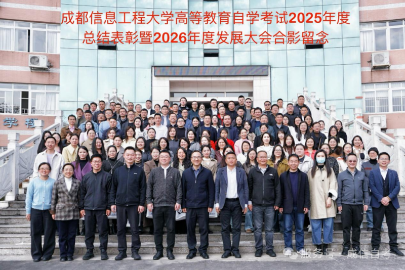 全体参会代表合影留念。此次大会凝聚了发展共识、明确了工作方向,旨在进一步深化继续教育改革,切实提升自考人才培养质量,为成都信息大学2026年自考高质量发展奠定基础,为校地、校校合作共赢注入崭新动能。