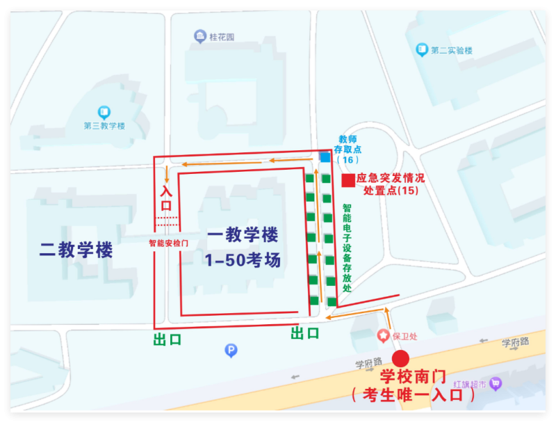 (二)详细地址:成都市西南航空港经济开发区学府路一段24号(导航地图显示南门为考生进入考点唯一入口)