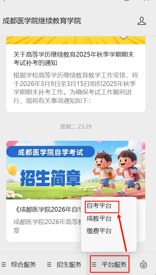 第二步:进入“成都医学院继续教育学院”公众号界面后,点击右下角“平台服务”后点击“自考平台。