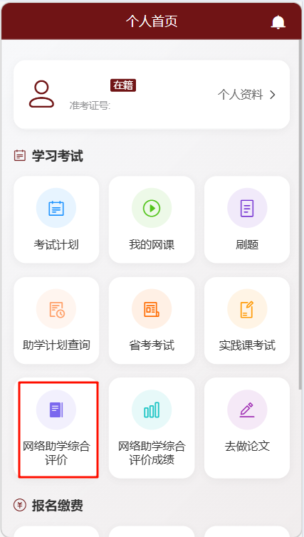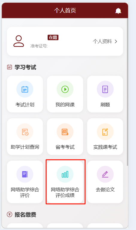 第五步:在“自考平台学生端-学习考试”,点击“网络助学综合评价成绩”可查看有效成绩和全部成绩。