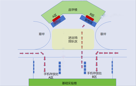 我校考点设置有手机存放区、智能安检区、考场安检区,考场各区域分布图见图2。
