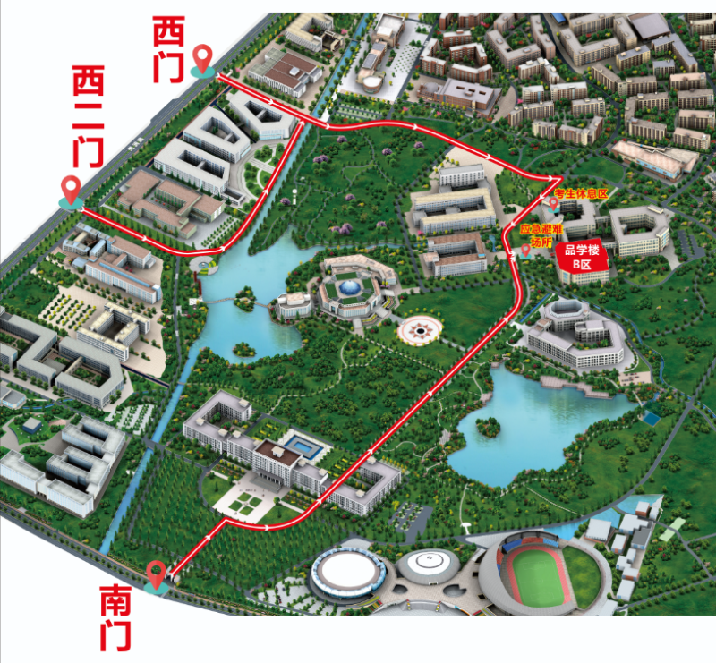 考生可通过清水河校区西门、西二门、南门进入考点,从校门口步行至考场所在品学楼约需20分钟,请考生合理安排时间。考点入校路线图见图1。