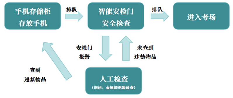 2.考生到达考点后,应首先将手机等不得带入考点(或考点封闭区域)的小件物品放置在手机存放区,在工作人员的引导下有序排队通过智能安检门进行安检,安检通过后即可前往对应考场。