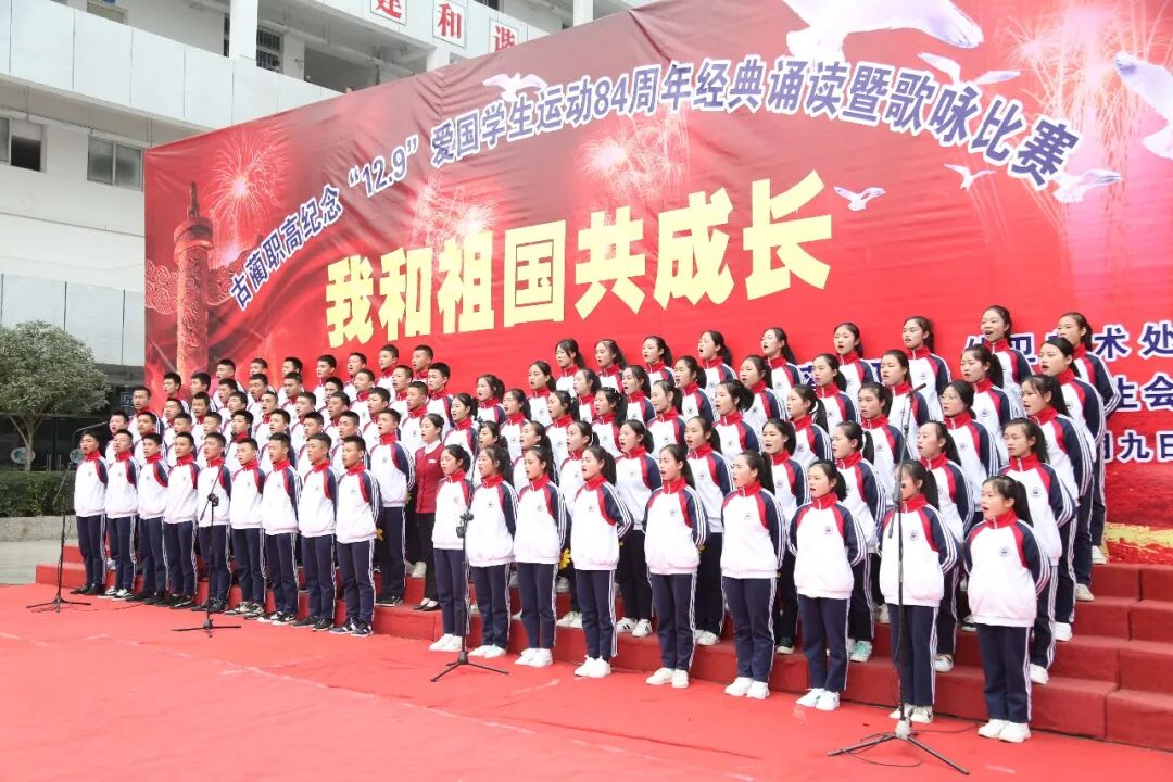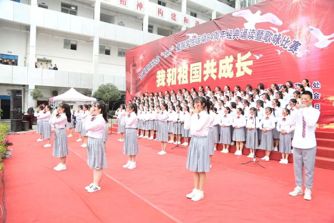 为大力弘扬爱国精神,加强校园文化建设,丰富学生校园生活,在“一二·九”爱国学生运动84周年之际,我校举行了以“我和祖国共成长”为主题的经典诵读暨歌咏比赛。