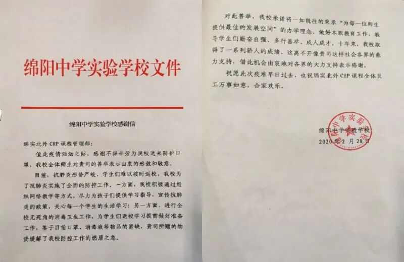 突如其来的疫情,牵动着全国人民的心,在这个口罩极其紧缺的非常时期,北京外国语大学CHP课程项目办公室积极寻求各方渠道,几经辗转从国外采购到的1000只医用口罩,终于在2月27日晚到达成都双流机场清关,并于2月28日捐赠给绵阳中学实验学校,副校长廖先虎和办公室主任李孙娃代表学校接收了捐赠物资,并送上了感谢信。关键时期,并肩抗疫,北外CHP项目心怀师生,情系绵实,用实际行动为抗击疫情做出了自己的努力。希望在学校的领导下,齐心协力,共同打赢防控新型冠状病毒感染肺炎疫情攻坚战!