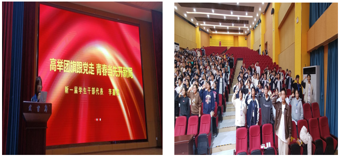 团委新一届学生干部代表李嘉雯宣读“高举团旗跟党走,青春当先开新局”的工作誓言,开启团委工作新征程。
