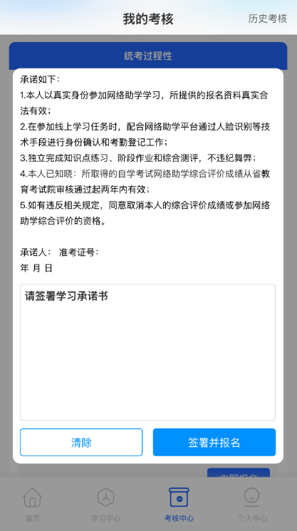 5、考核报名,点击【综合性评价中心】,找到自己报名的科目点击【立即报名】,弹出承诺书,认真阅读承诺书内容后,在签署框内,签字后点击【确定】,继续进行报名核对信息,无误后点击【立即报名】