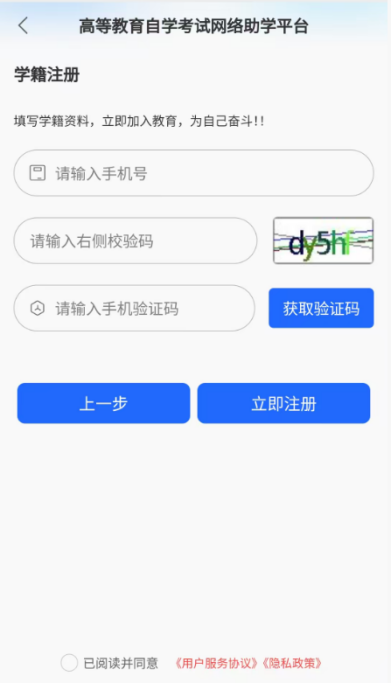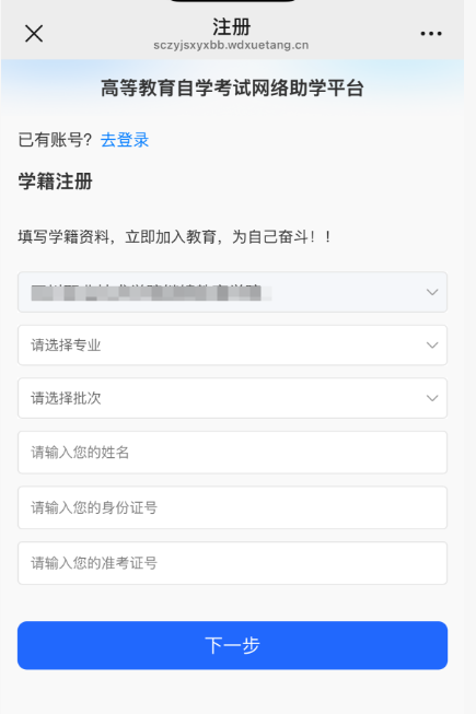 1、没有账号学员按照要求填写信息,批次是注册批次,专业选择自己注册的专业,姓名、准考证号、身份证号码和手机号一定要填写正确,点击【下一步】,填写手机号码和验证码,获取注册验证码,勾选“已阅读并同意《用户服务协议》”后,点击【立即注册】,完成注册