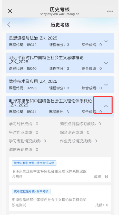 8、成绩查看,点击【综合性评价中心】—【历史考核】—点击课程名称查看课程的分数