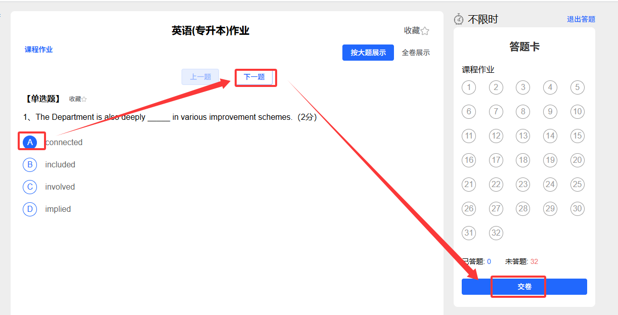 2、点击【答题】—点击【阅读完成,进入考核】,进入人脸识别页面,识别成功后进入到答题页面,完成一个题目后点击【下一题】,当答题卡区域全部题号变成蓝色表示全部完成,点击【交卷】完成本试卷的本次考核(作业,知识点测验练习,综合测评均需要人脸识别)
