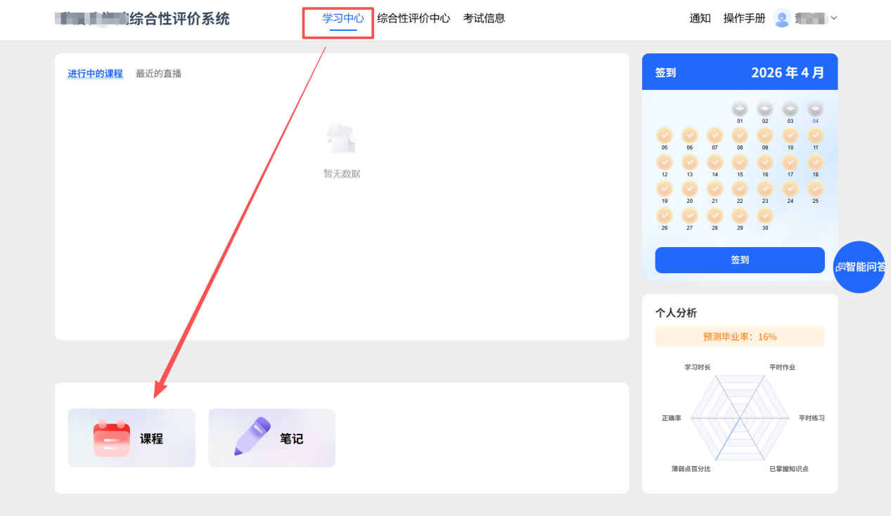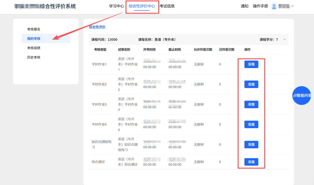 1、点击【综合评价中心】—点击【我的考核】,选择科目完成四次平时作业和知识点测验和综合测评,(一定需要在规定的时间内完成)