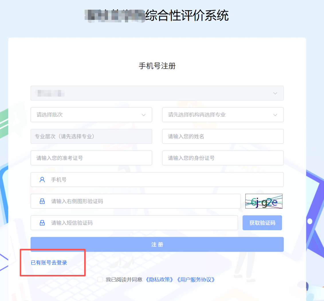 点击左下角“已有账号去登录”,输入正确的账号密码,账号为身份证号,密码默认为123456,如之前有重置过密码,请使用重置后的密码登录,填写完账号密码后,勾选“同意隐私政策和用户服务协议”最后点击【登录】。