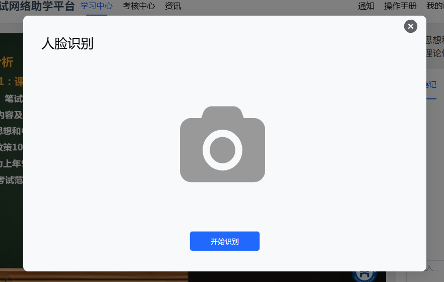 4、点击当前学习的课程名称,进入视频学习页面,按照目录顺序进行学习,课程每个章节学习时需要进入人脸识别,识别成功后进入视频学习播放页面。
