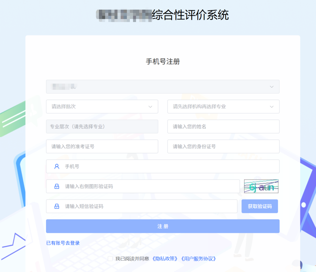 1、按照要求填写信息,批次是注册批次,专业选择自己注册的专业,姓名、准考证号、身份证号码和手机号一定要填写正确,基本信息填写完成后输入验证码获取手机短信验证码,填写验证码后,勾选“同意隐私政策和用户服务协议”后,点击【注册】完成注册。