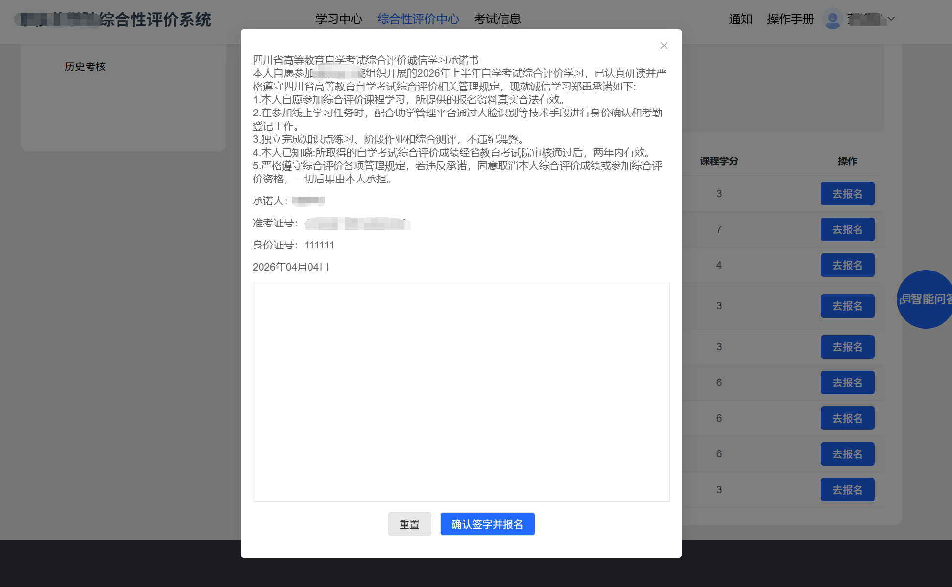 1、点击【综合评价中心】—【报名】,选择自己需要报名的综合性评价课程,点击【去报名】,进入到承诺书签署页面。