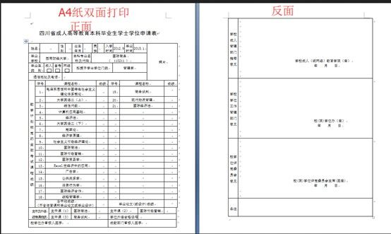 (二)完成网上信息申报后,学院将在5月22日15点前完成全部数据审核。学生须及时关注,审核未通过的须按页面提示信息在申请时限内修改后再次提交,直至审核通过。审核通过的学生方可打印《基本信息登记表》和《四川省成人高等教育本科毕业生学士学位申请表》(以下简称“学位申请表”)。《学位申请表》为正反两面,须按打印设置要求使用A4纸双面打印,如图: