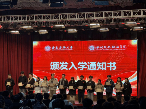 唐碧波鼓励自考新生充分利用好两校学习平台,持续提升综合素养。林琳介绍了西南石油大学自考本科办学优势特点,勉励新生利用好课余时间完成自考学习和考试。随后,唐碧波、林琳分别为新生代表颁发入学通知书,为2025年优秀自考生颁发荣誉证书。