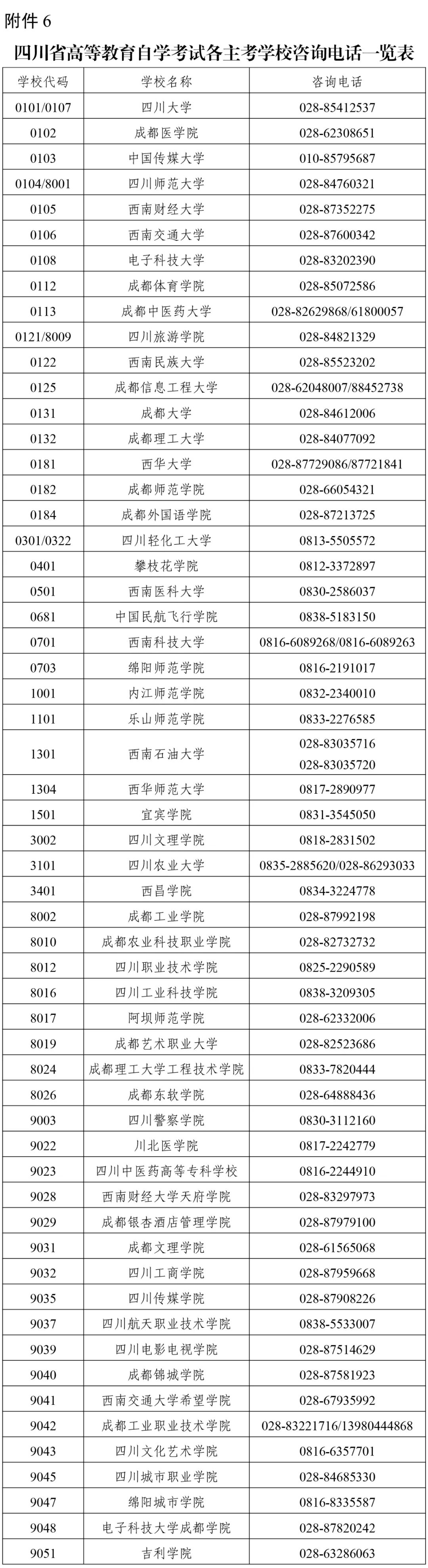 6.四川省高等教育自学考试各主考学校咨询电话一览表